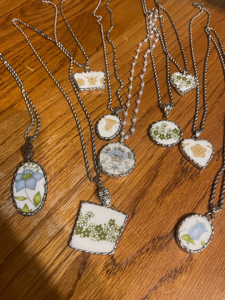 These pieces are made from up-cycled damaged vintage China plates/glass that have lost their utilitarian purpose. They have been broken down, delicately ground into shape, and hand soldered using jewelry grade silver. Finally each pendant is polished using Renaissance wax. Some China shards have been smoothed and painted with acrylic and then sealed.